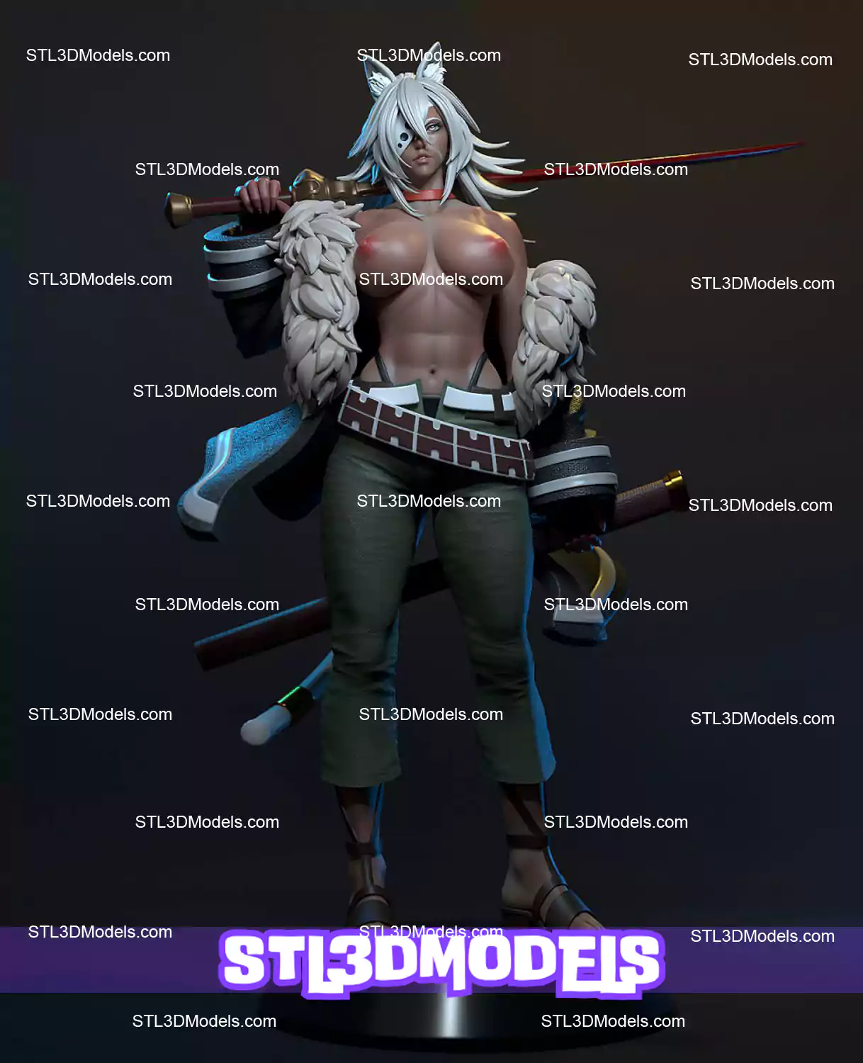 This model depicts Ghishlaine in her signature beast-woman form, with wolf-like ears, tail, and sharp fangs, emphasizing her wild heritage. She is posed in a commanding stance, gripping her massive sword with both hands, ready for combat. Her muscular yet graceful body, tribal-inspired armor, and warrior’s confidence are rendered in crisp, detailed form.