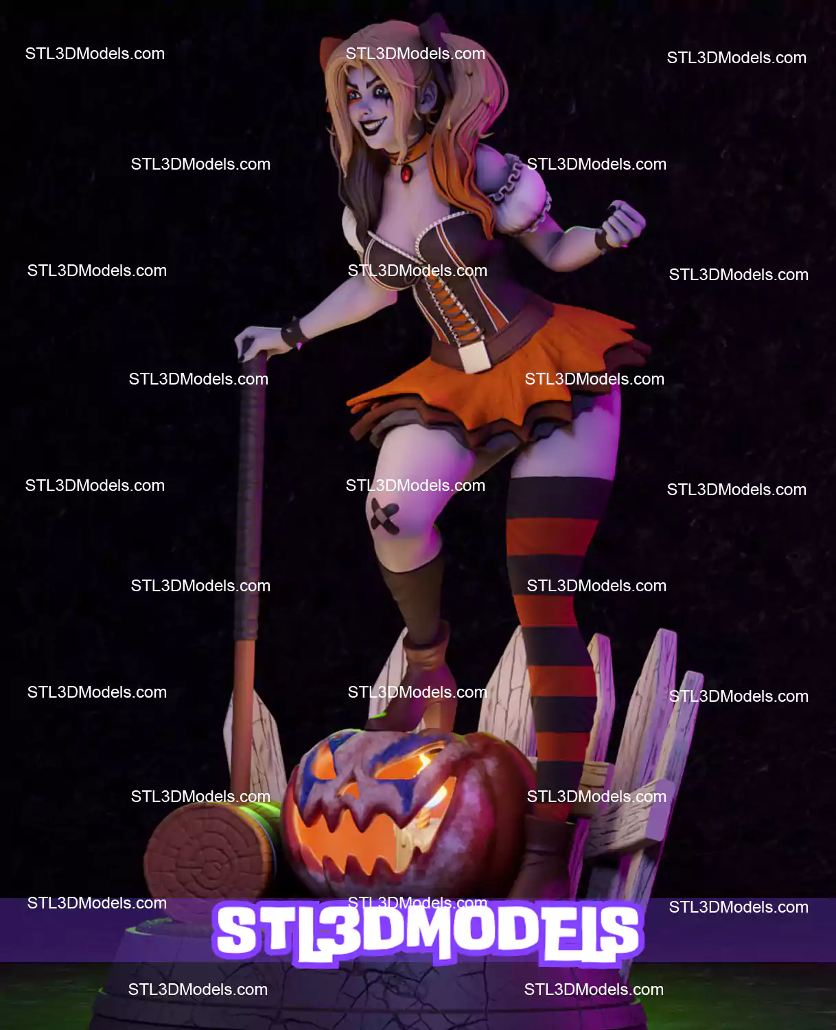 Dressed in a mischievous blend of pumpkin-themed attire, striped stockings, and her signature mallet, Harley stands ready to cause some festive mayhem. From her expressive grin to the fine details on her costume, every element of this model is crafted for collectors and fans who love her unpredictable energy.