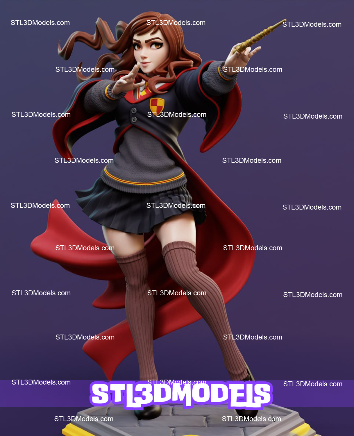 The base features the Hogwarts crest and scattered spellbooks, representing her deep connection to learning and the magical arts. Designed with care and accuracy, this model is pre-keyed for simple multi-part assembly, ensuring crisp detail and clean printing.